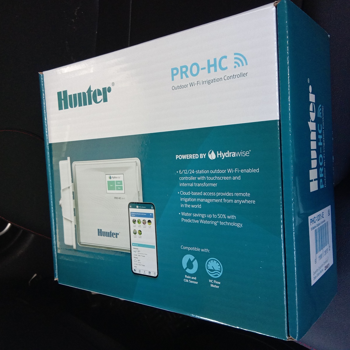 Пульт управления Hunter PHC-1201-E с программным обеспечением Hydrawise™ для управления двенадцатью зонами полива и установки на улице.