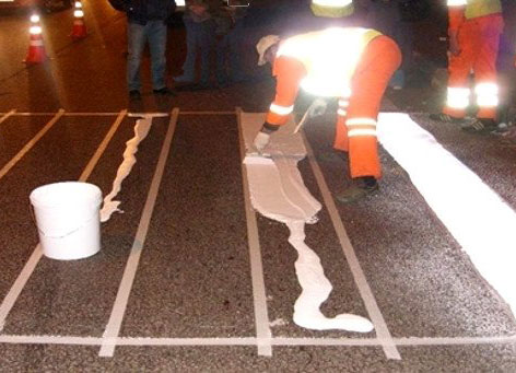 Полученная масса тщательно перемешивается в течение 2 - 3 минут и наносится разметочными машинами со специальными надставками или вручную при помощи шпателя и трафаретов на чистое, сухое дорожное покрытие.