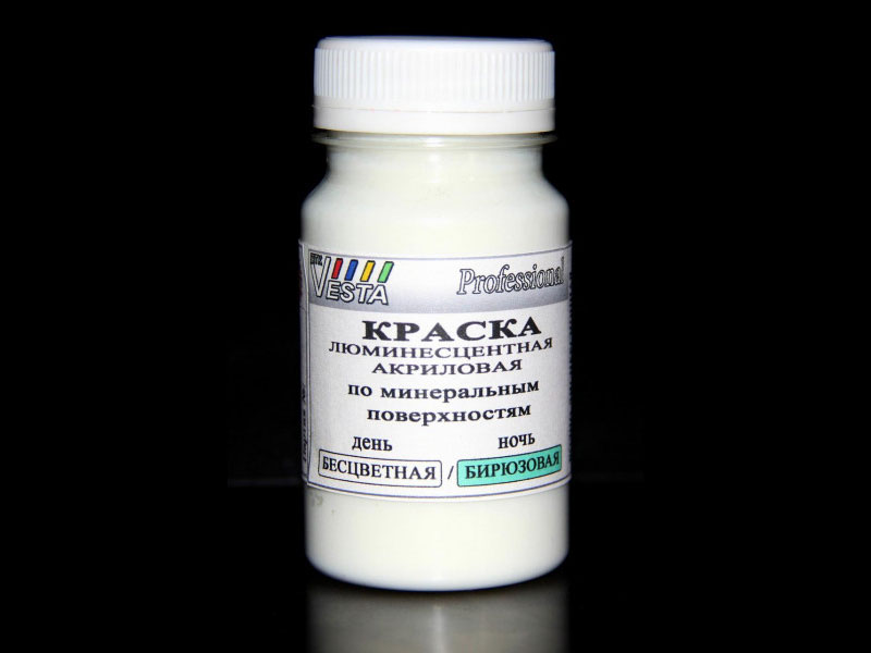 Краска люминесцентная по минеральным поверхностям бесцветная/ бирюзовая (день / ночь) оптимальна для работ по камню, бетону, кирпичу и другим пористым материалам.