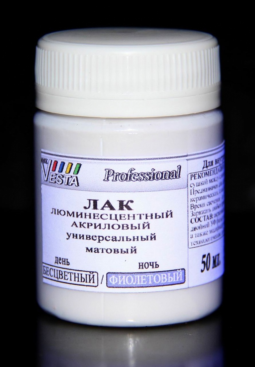 Лак люминесцентный бесцветный / фиолетовый на основе акрила обладает более стойким свечением в отличие от других люминесцентных красок, поскольку в его составе нет дополнительных компонентов и цветных пигментов.