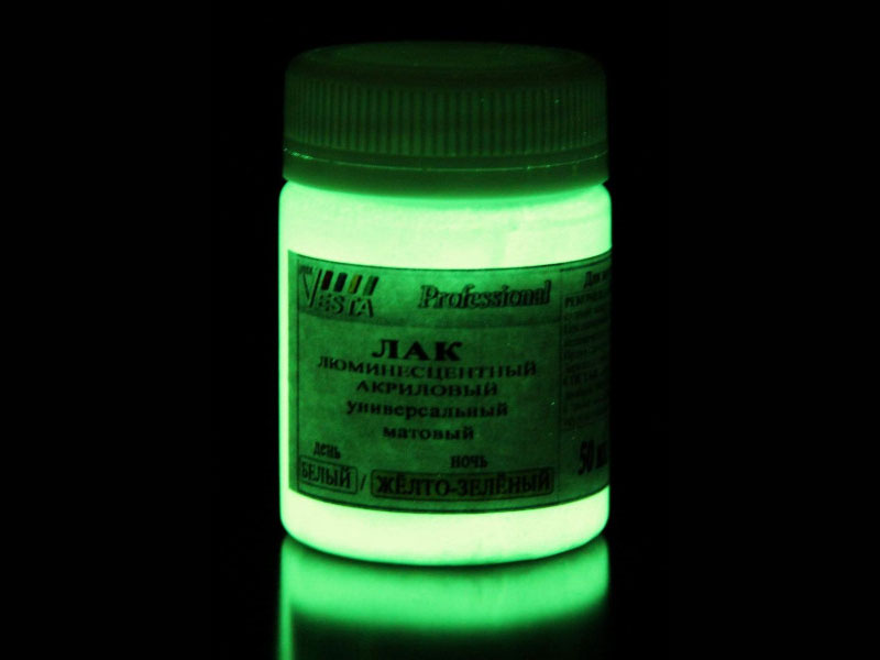 При освещении лак бесцветный, в темноте светится желто-зеленым цветом.