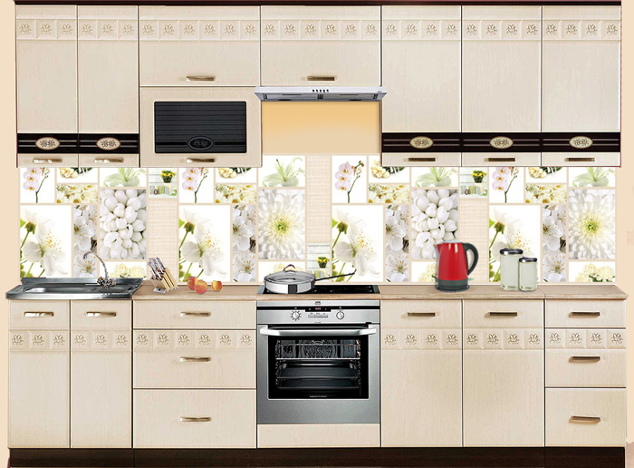 Коллаж из белоснежных цветов фартука МДФ AF 28 никого не оставит равнодушными. Галерея из нежных орхидей, хризантем, пионов и тюльпанов освежит и украсит интерьер кухни или гостиной. Белая мебель или стены помогут скомпоновать нежный классический интерьер, темный фон сделает его более контрастным и современным. Глянцевый слой МДФ-панели превосходно оберегает стены от влаги, загрязнений и выгорания на солнце.