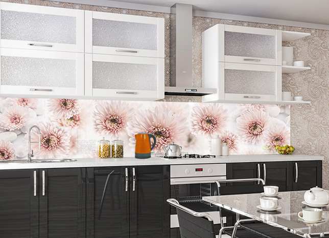 Композиция из нежно-розовых цветов фартука МДФ AF 33 станет главным декоративным элементом кухни или гостиной. Соединив светлую мебель или стены вместе с МДФ панелью, получим нежный классический интерьер, темные поверхности добавят контраста.