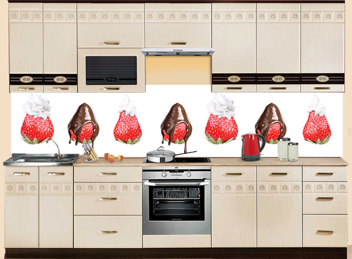 Эффектный фартук МДФ Клубничный десерт с клубничкой в шоколаде и сливках - соблазнительная композиция для украшения стен кухни, гостиной или столовой зоны. Дразнящие ягоды возвращают нас в лето, чтобы еще раз напомнить о изысканных фруктовых и ягодных десертах. Яркие цвета на белом фоне - отличное контрастное сочетание, которое добавляет изюминку в интерьер комнаты. Глянцевый красочный слой надежно защищает поверхности стен от брызг, влаги и загрязнений.