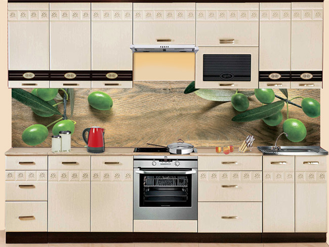 Фартук МДФ SP-180 с изображением зеленых оливок на деревянном столе эффектно выглядит на стенах кухни, столовой зоны, пиццерии, кафе. Изображение аппетитных оливок дарит атмосферу тепла и солнца. Прозрачный глянцевый слой имитирует стеклянную поверхность, не уступая ей в надежной защите от проникновения влаги и загрязнений.