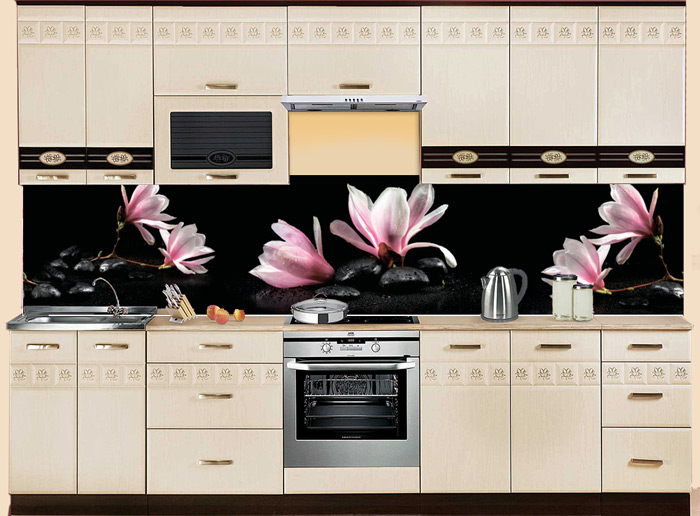 Фартук МДФ SP 130 с магнолиямиСтильный черный фартук МДФ Магнолия на камнях с розовыми цветами великолепно смотрится в интерьере кухни, гостиницы или кафе. Контрастные цвета и реалистичный рисунок мдф-панели SP 130 делает яркий акцент на стенах. Глянцевый красочный слой надежно защищает поверхности стен от брызг и загрязнений.