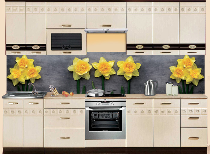 Оригинальный фартук МДФ Нарциссы подарит хорошее настроение на кухне. В интерьере SP 132 хорошо сочетается с бежевыми, серыми, золотистыми оттенками кухонных фасадов.