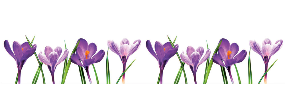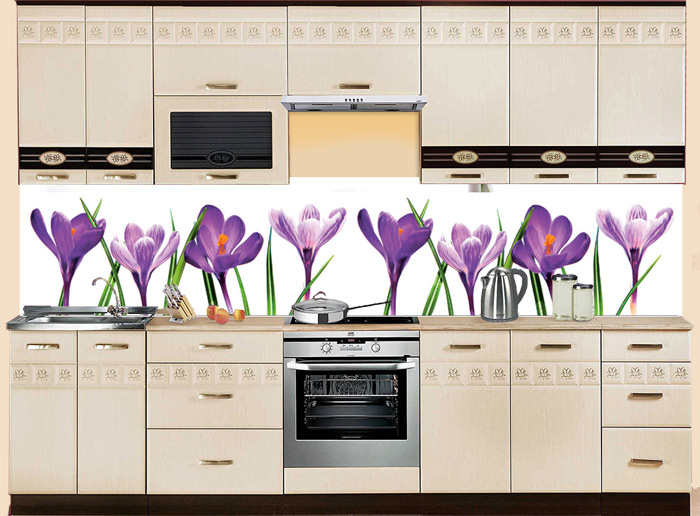 Белый фартук МДФ Крокусы с выстроившимися в ряд сиреневыми цветками - великолепная защита для стен и эффектный декоративный элемент кухни. Нежные цветы создают контраст с белоснежным фоном панели, привлекают внимание, украшают интерьер. Стеновая панель SP 135 может служить украшением и защитой стен кухни, холлов гостиниц, залов кафе, салонов красоты. Глянцевый красочный слой надежно защищает поверхности стен от брызг, влаги и загрязнений.
