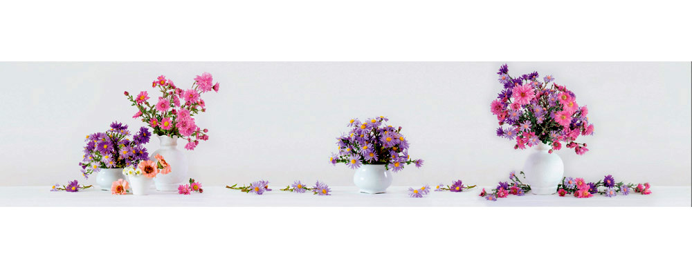 Оригинальная композиция фартука МДФ Цветочная симфония способна украсить и защитить стены интерьера. Летние букеты в белых вазах выглядят очень реалистично и создают иллюзию присутствия и продолжения поверхности столешницы. Стеновую панель МДФ SP 143 можно установить на кухне, в холлах гостиниц, залах кафе, ресторанов, салонах красоты. Глянцевый слой надежно защищает поверхности от брызг, влаги и загрязнений.