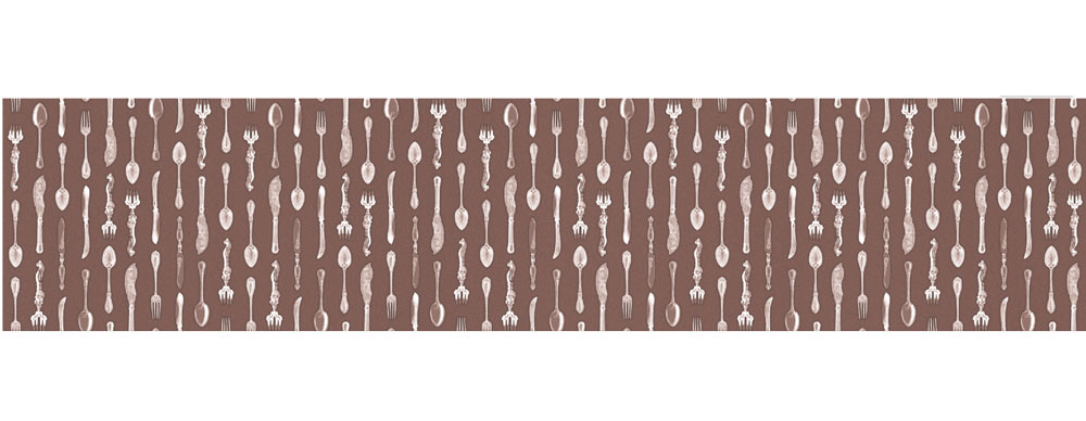 Фартук МДФ SP 175 с изображением столовых приборов на фоне шоколадного цвета - оригинальное украшение рабочих стен кухни или кафе. Надежный глянцевый слой МДФ панели имитирует стеклянную поверхность и превосходно защищает уязвимую зону от влаги и загрязнений.