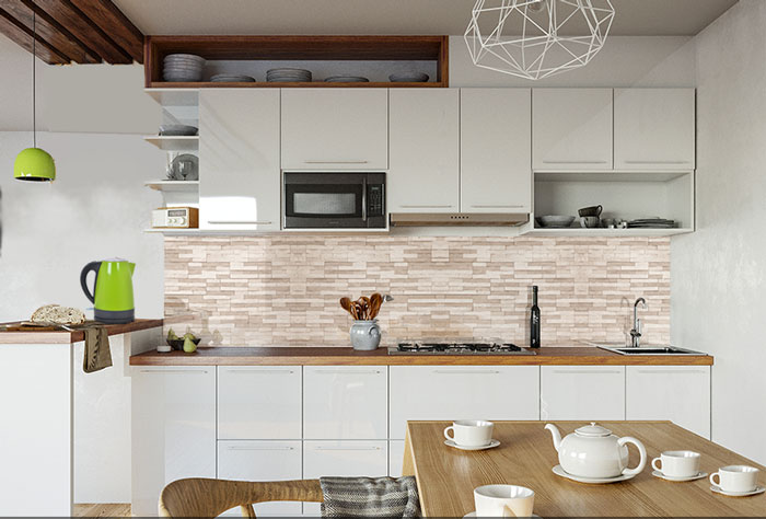 Фартук SP-055 с интересным рисунком под светлый кирпич станет превосходным украшением интерьера кухни. Пастельный оттенок и модная фактура фартука создают спокойный нейтральный фон для контраста с мебелью и бытовой техникой. Глянцевый слой панели отлично справится с защитой поверхностей от влаги и жира.