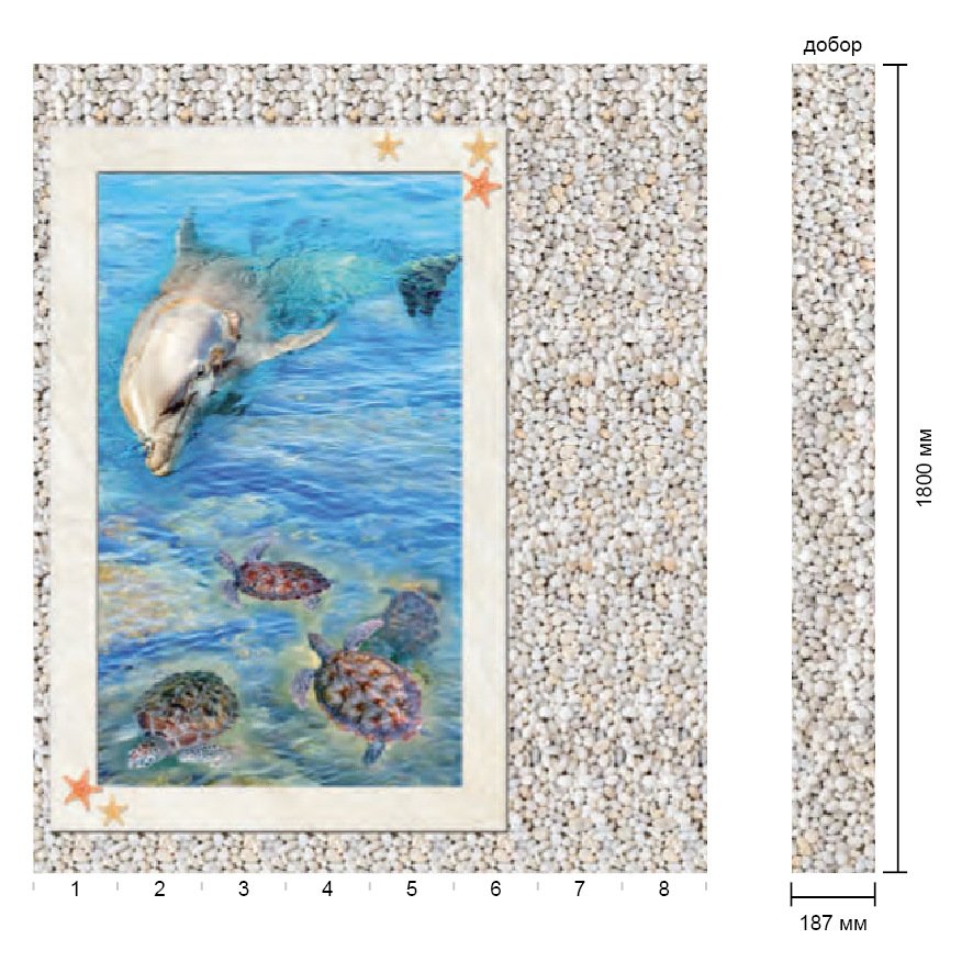 Оплата картой онлайн переводЖивописный 3D пол Карибы с дельфинами и имитацией речной гальки станет главным украшением ванной комнаты. Он состоит из 8 панелей. Морской пейзаж - это подходящая тема для SPC-пола для ванной, кухни и других помещений с высокой влажностью.
