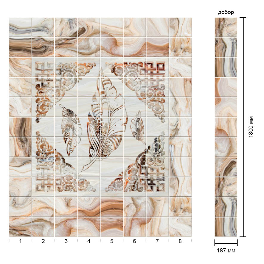 Коллекция Валенсия состоит из 8 ламелей. Если комплект покрывает не всю площадь помещения, то можно купить отдельно доборы с аналогичным дизайном размером 1800*187 см. Занимаемая площадь: 2,7 м2.