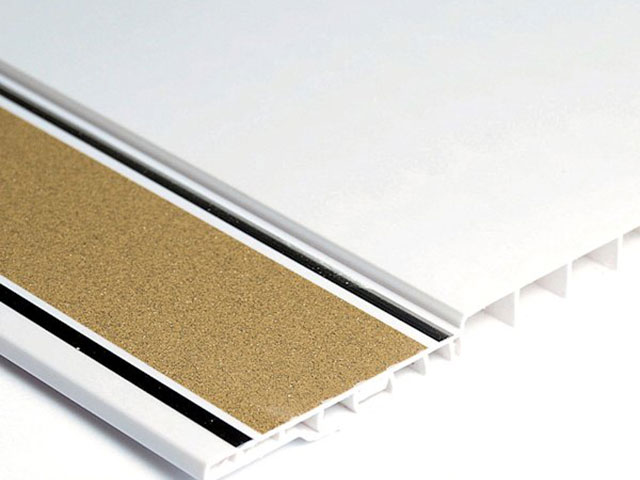 Нарядные панели ПВХ 16-GF-05 (2.95 м) от французского производителя Sarl Makindustri TDS с широкой золотистой полосой станут достойным украшением любого интерьера. Ширина ламели составляет всего 16 см. Производители выпустили панели различной высоты и ширины, не ограничиваясь стандартным размером 250х2700 мм. В каталоге присутствуют ламели высотой 2,7 м, 2,95 м и 3 м. В зависимости от дизайна и размеров помещения можно выбрать ПВХ шириной 15, 16, 20 и 25 см.