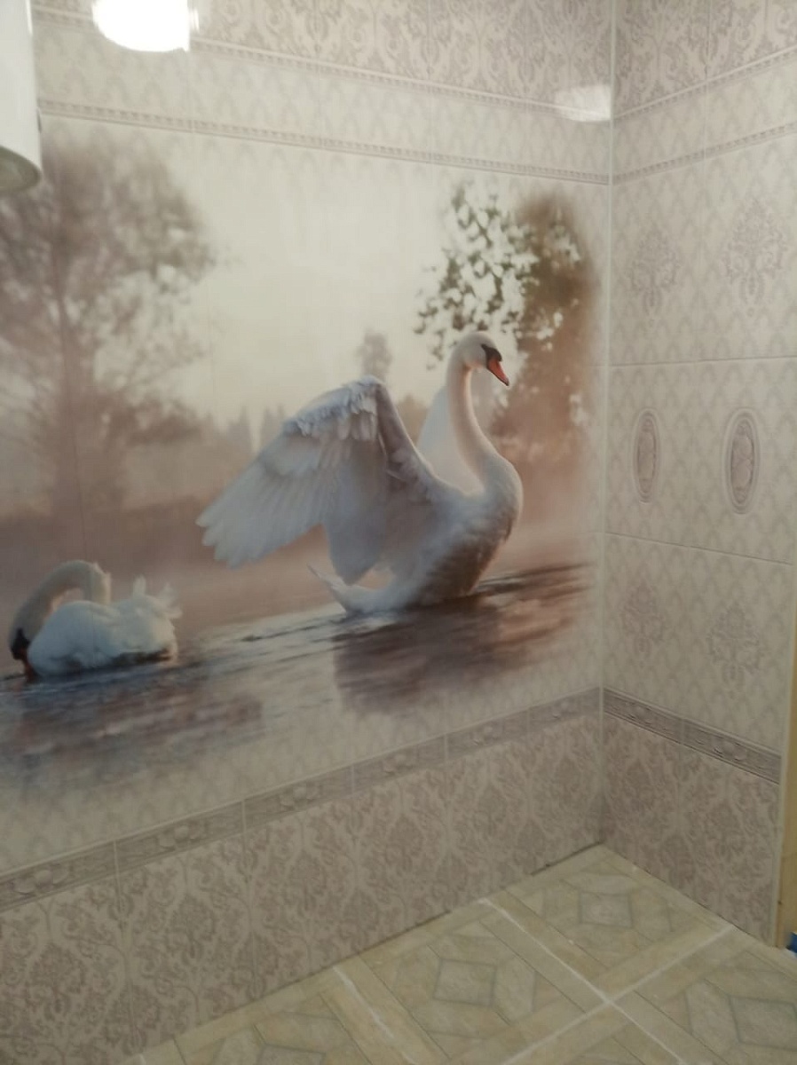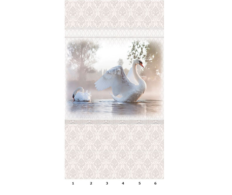 Живописный рисунок с лебединой парой - главный декоративный элемент коллекции панелей ПВХ Панда Дамасский узор. Комплект панно состоит из 6 ламелей и продается комплектом.