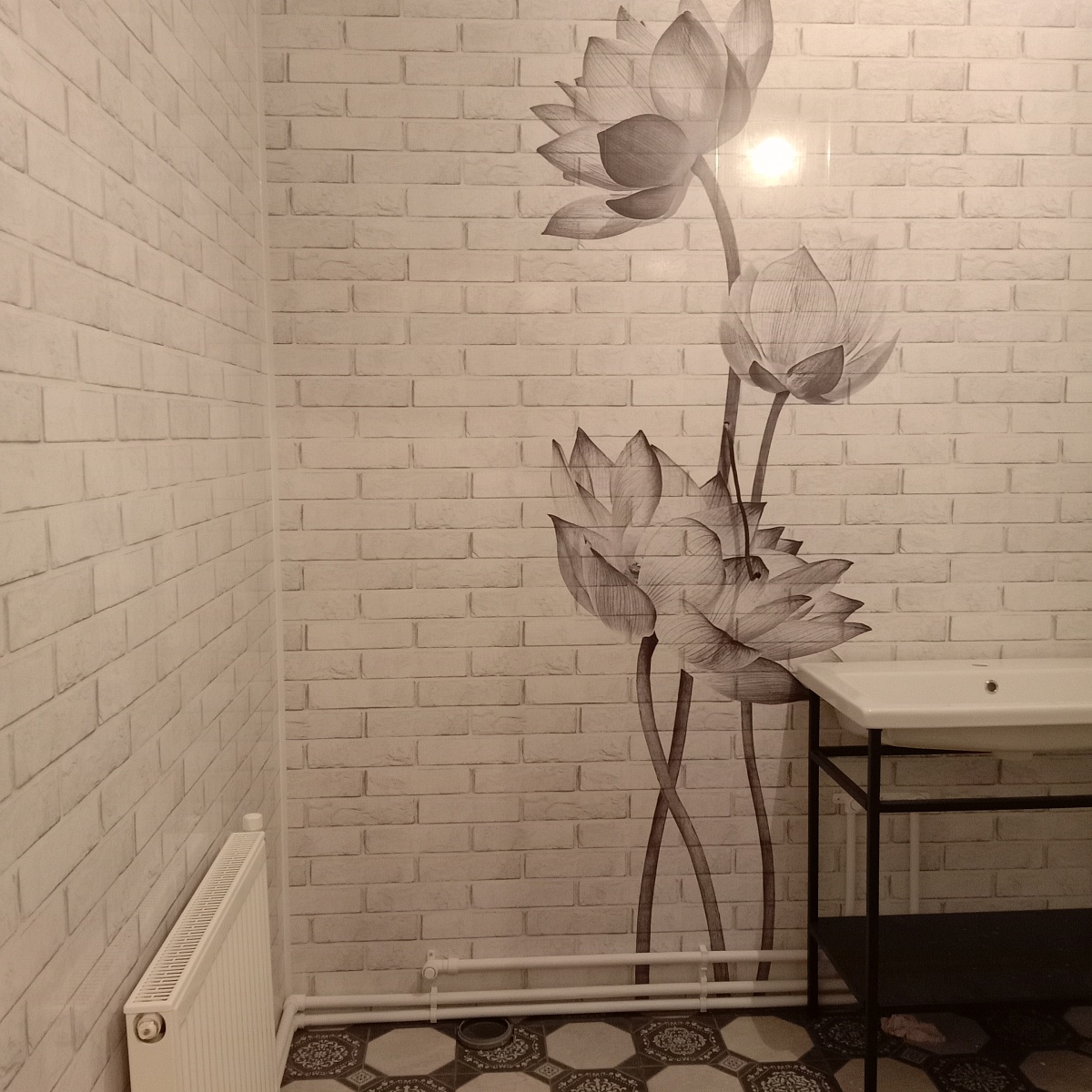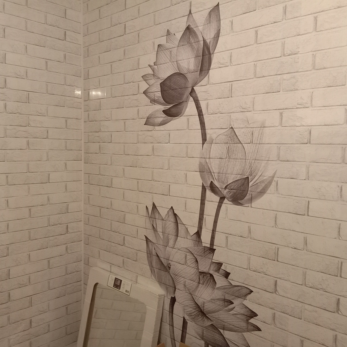 Оплата картой онлайн переводРисунок 2 панелей ПВХ Панда монохромной коллекции Цветочные узоры – это комплект из 4х ламелей с изображением цветов на фоне белой кирпичной стены.