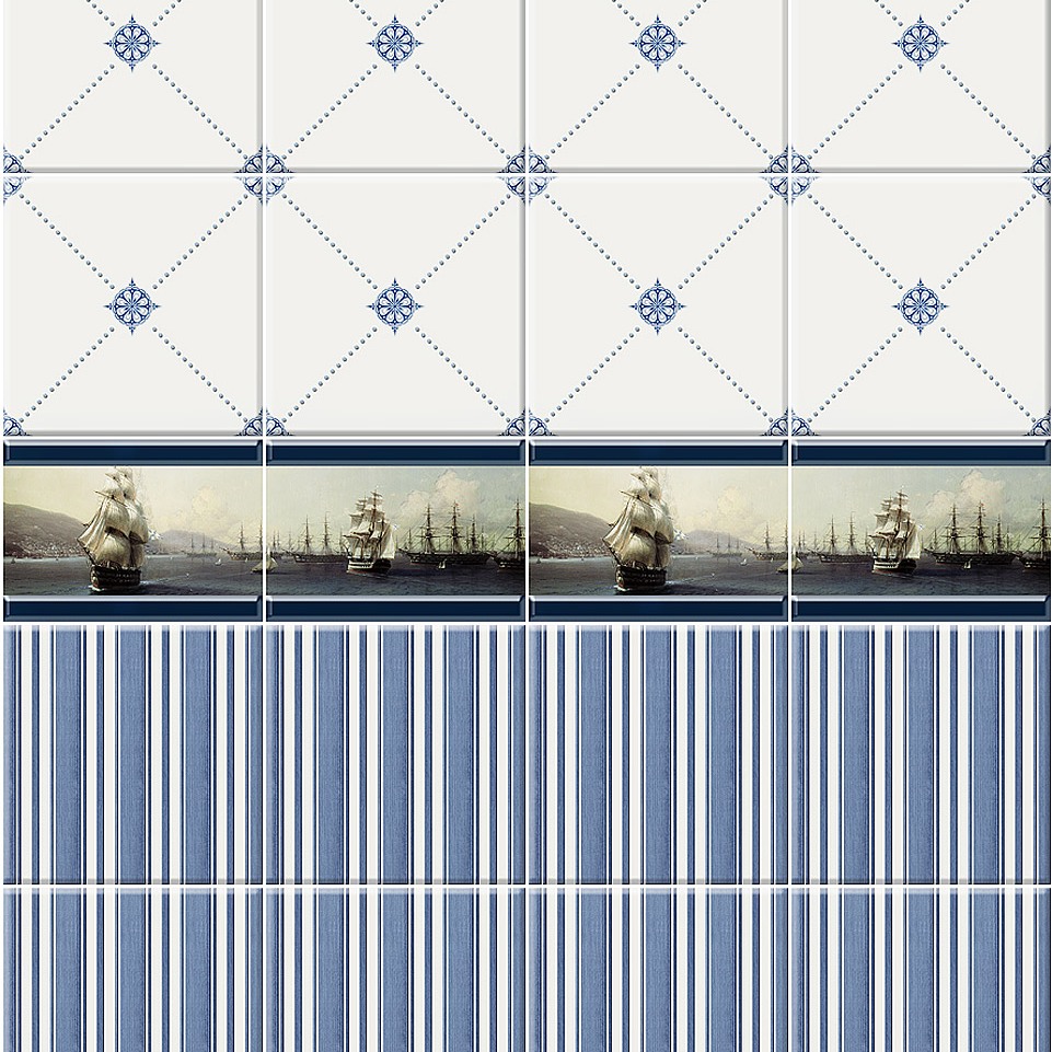 Панели ПВХ Корабли продаются только комплектом. Узор составляют две панели. Аналогичен рисунку коллекции Фрегат с прекрасным качеством печати. Имеет отличия в изображении фриза. Поверхность панели защищена трёхслойным лаком.
