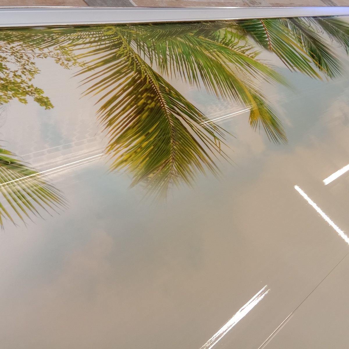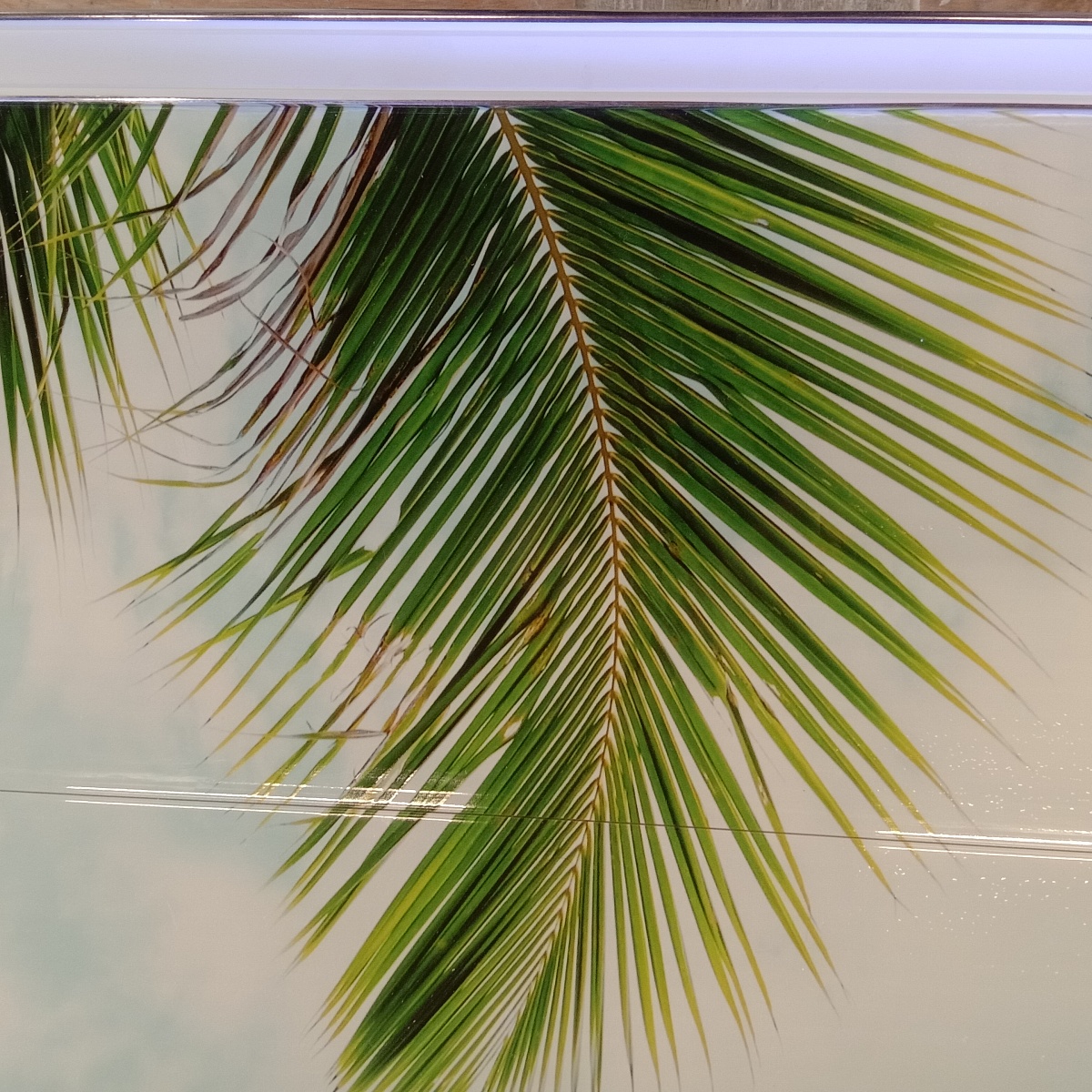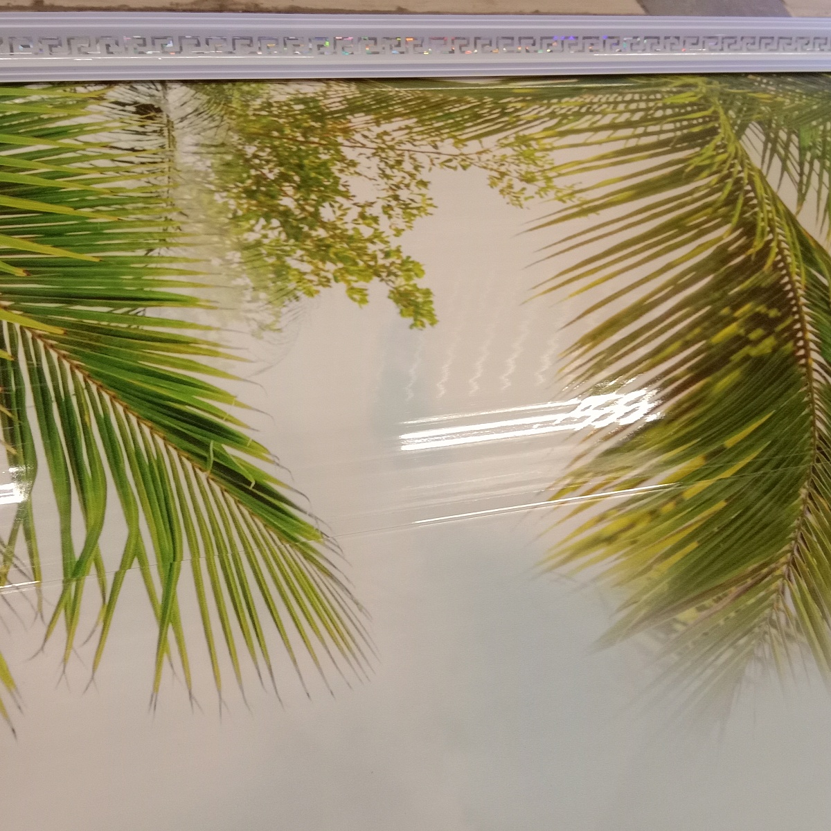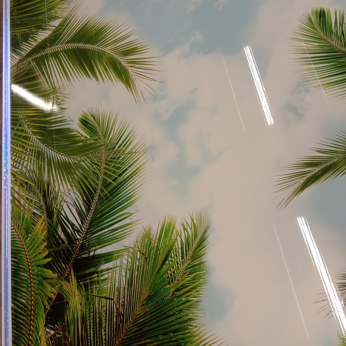Оплата картой онлайн переводПластиковые потолочные панели ПВХ Небо Пальмы - это живописное панно с ярким южным небом размером 1800х1000 мм. Зелёные пальмовые ветви на ярко-голубом фоне поднимают настроение, придают тепла и уюта.