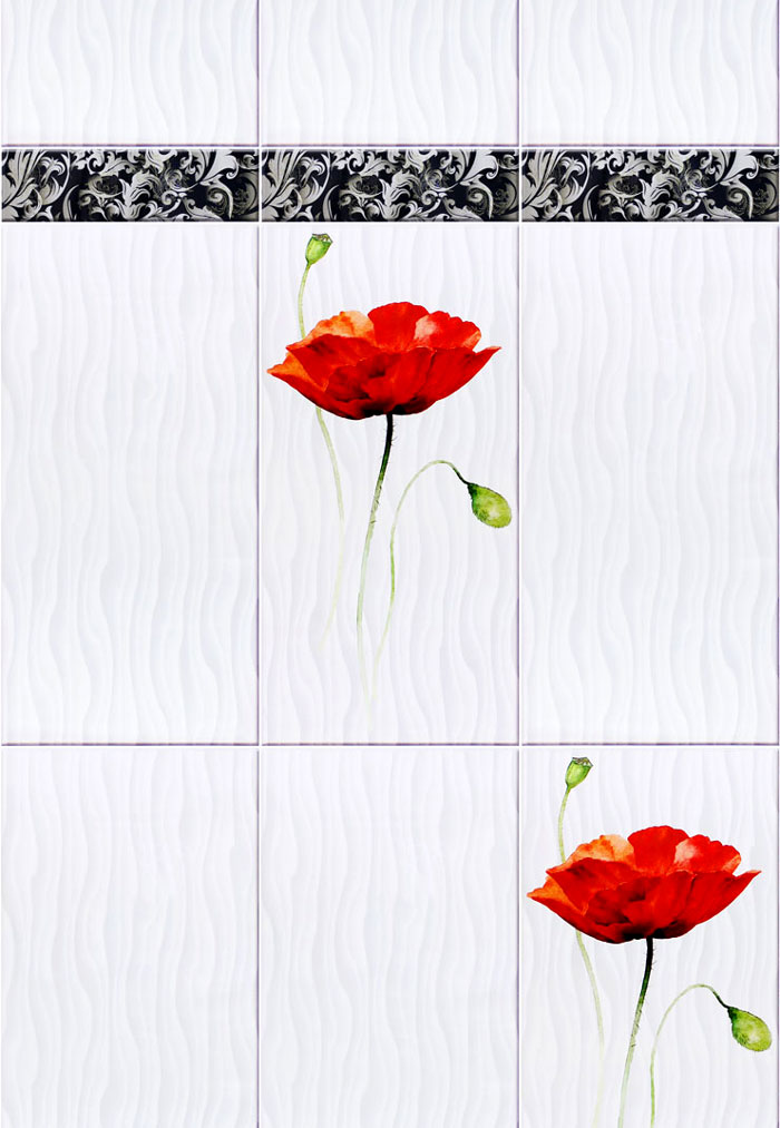 Оплата картой онлайн переводПанель ПВХ Novita Алые маки (узор), состоящий из красных маков на белом фоне, украшен темным декоративным бордюром с эффектом мерцания. Добор украшен флористическим узором снизу доверху. Основной рисунок состоит из трех ламелей и продается комплектом. Пластиковые стеновые панели подходят не только для отделки ванной, кухни, лоджии, но также для стен офисов, учреждений, нежилых помещений.
