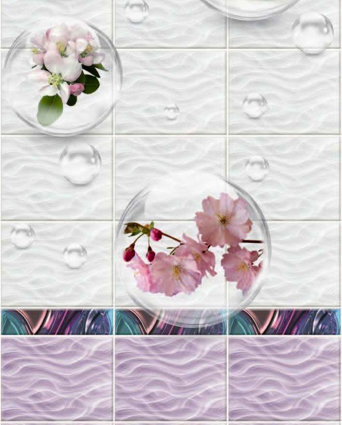 Добор этой коллекции состоит из одной ламели. Он украшен цветочным бордюром. Верхняя часть панели - белая, нижняя окрашена в светло-сиреневый цвет. На панно изображены увеличенные капли воды, в которых находятся цветы сирени различных цветов. Оригинальный рисунок панели состоит из трех ламелей и продается комплектом.